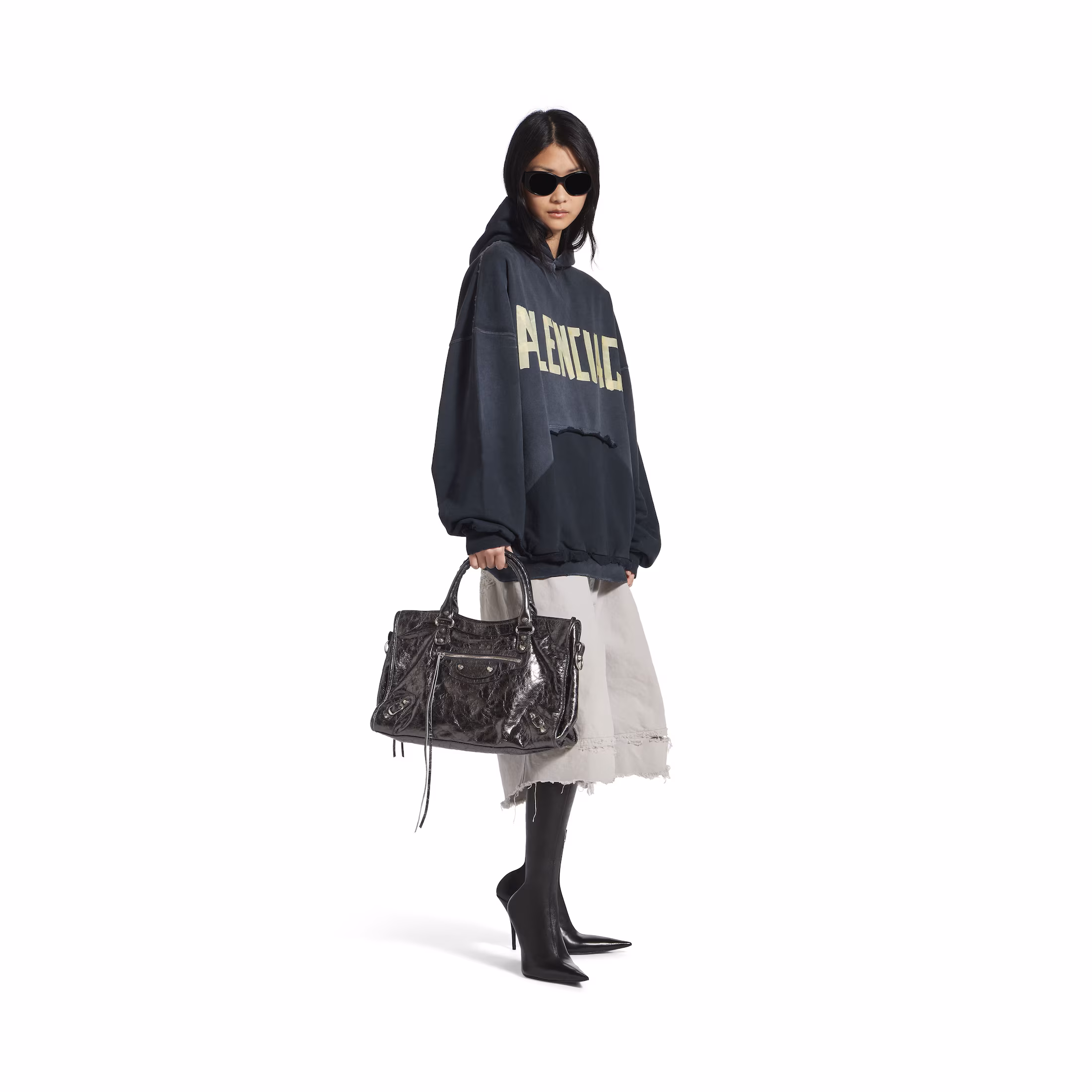 Hoodie Ripped Pocket Tape Type Oversized en Negro Degradado